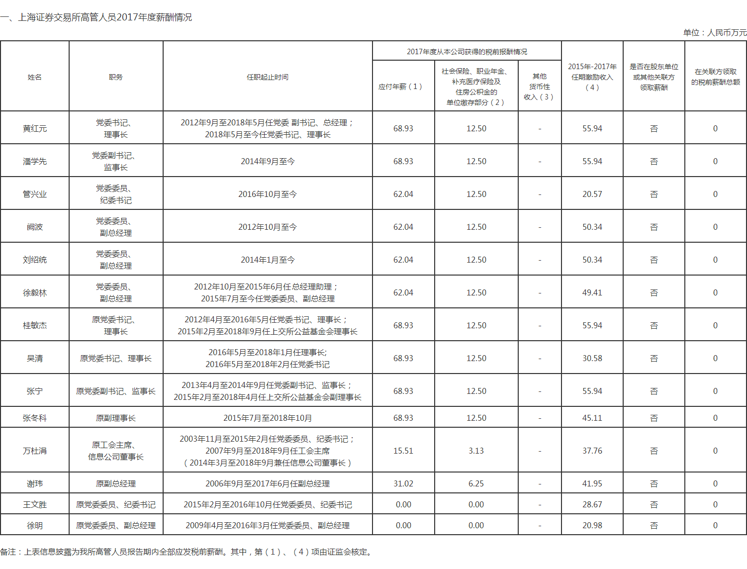 上海证券交易所2017年度薪酬情况
